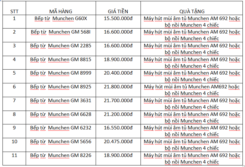 Bảng báo giá bếp từ Munchen mới nhất năm 2020.