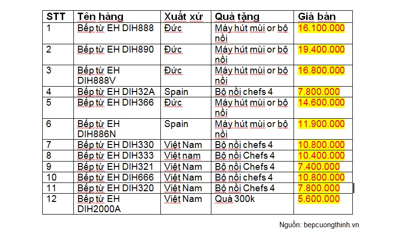 Bảng giá bếp từ Chefs mới xả kho tháng 11/2020