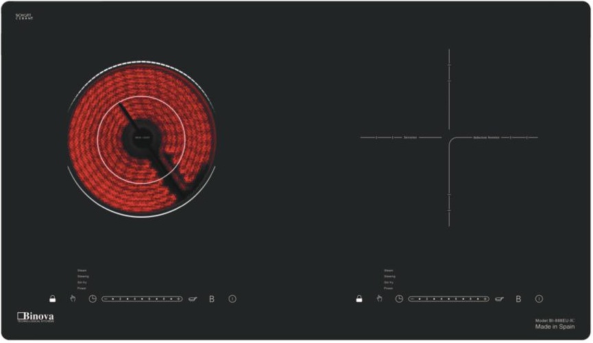 Bếp hỗn hợp một điện, một từ âm kính 02 vùng nấu, mặt kính Kanger, bo viền nhôm 4 cạnh, siêu bền