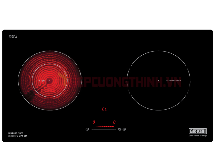 - Bếp điện từ Giovani hỗn hợp với bếp 1 từ + 1 điện tổngcông suất 3600 w ( L 120-190/800-1900 – R210/1500/2000 )