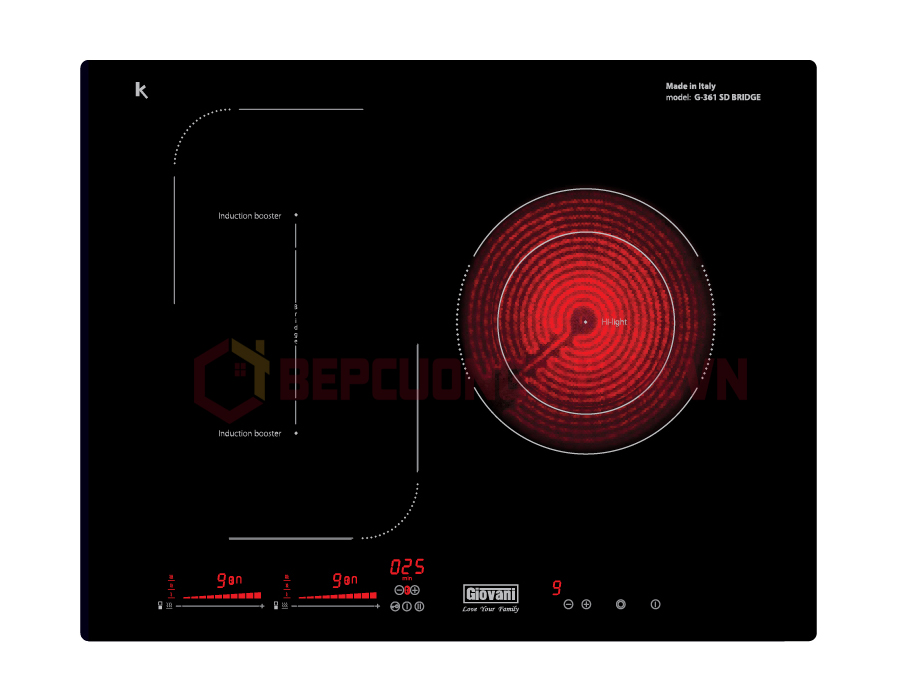 - Bếp điện từ Giovani hỗn hợp với bếp 2 từ + 1 điện tổng công suất 5900 w ( L12100/3700 – L2 2100/3700 – R140-210/1000/2200 )Điều