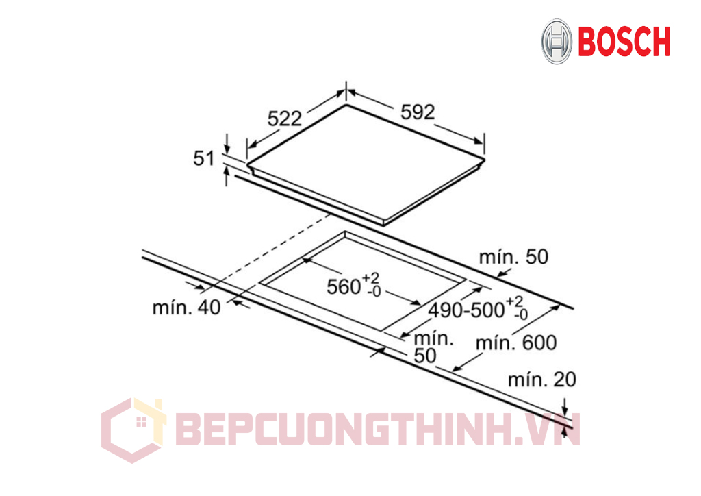 Kích thước bếp (chiều cao, chiều rộng, chiều sâu) 51 x 592 x 522 mm