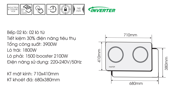 Bếp từ Faster FS 782I còn tích hợp đầy đủ các tính năng thông minh và an toàn sau:
