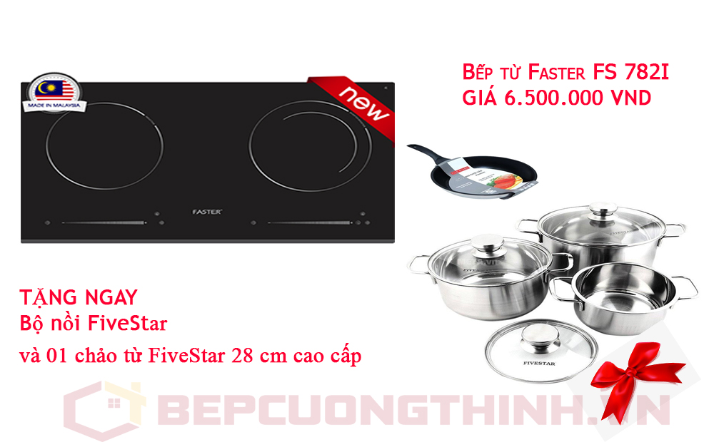 Bếp từ Faster FS 782I có giá niêm yết của hãng là 13.600.000VND, khi bạn mua hàng ở Bếp Cường Thịnh 801Quang Trung – Hà Đông – Hà Nội bạn sẽ được chiết khấu với giá hấp dẫn nhất là 6.500.000 VND và được tặng kèm 01 bộ nồi FiveStar 4 chiếc và 01 chảo từ FiveStar 28 cm tổng giá trị quà tặng lên đến 1.300.000 VND.