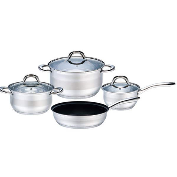 - Gồm bộ 3 nồi, 1 chảo chống dính với chất liệu inox 304 cao cấp sáng bóng và dày dặn