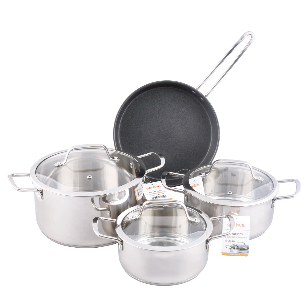 Bộ nồi Inox 3 đáy gồm 4 sản phẩm: 3 nồi phi 18cm, 20cm, 24cm và 1 chảo phi 24cm.