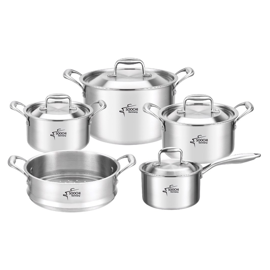 Bộ nồi bếp từ 5 món cao cấp Soochi Germany cao cấp, chất liệu inox 304 an toàn không độc hại, đáy thiết kế liền khối, thành nồi dày đáy liền. Sự lựa chọn thông minh của mọi gia đình tại Việt Nam.