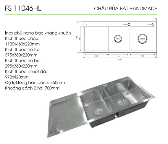 Chậu rửa bát FS 11046SLthiết kế thanh lịch, chất liệu inox 304 cao cấp, an toàn, dễ vệ sinh