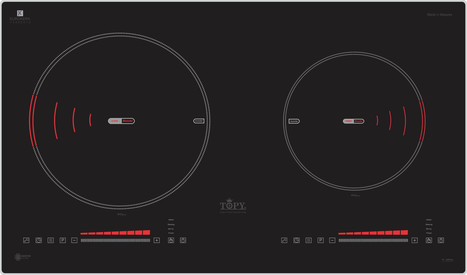 Công suất max 4300W (trái 23000W/27cm- Booster 2600W, phải 2000W/22cm - Booster 2200W)