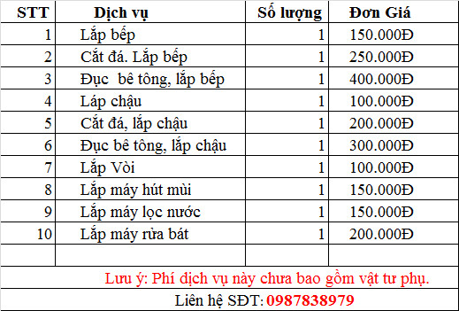 Trong khi có nhu cầu muốn lắp đặt bếp nhưng rất nhiều khách hàng vẫn băn khoăn không biết chi phí lắp đặt như thế nào? liệu trong quá trình lắp đặt có gặp phải những chi phí phát sinh gì không. Mời bạn tham khảo bảng giá dịch vụ lắp đặt của Bếp Cường Thịnh nhé.