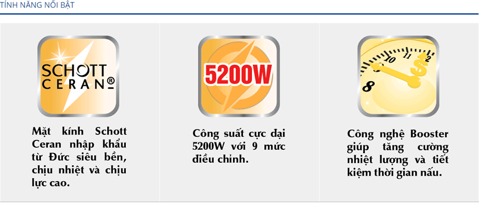 - Bếp sử dụng chất liệu mặt kính SchottCeran cao cấp nhập khẩu từ Đức rất bền đẹp có khả năng chịu nhiệt cực tốt, an toàn, không nguy hiểm đối với sức khỏe người sử dụng. Mặt kính SchottCeran sở hữu vô số đặc điểm tối ưu như chịu nhiệt lên tới 800 – 1000 độ C, chịu nặng lên đến 30kg bền bỉ với thời gian.