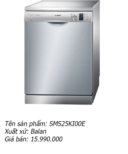 - Máy rửa bát Bosch SMS25KI00E là dòng máy cao cấp nhập khẩu nguyên chiếc từ Balan, làm từ inox cao cấp chống chầy xước và bám bẩn, không để lại vân tay, đặc biệt là chịu được nhiệt và lực ở cấp độ cao mang lại sản phẩm bền bỉ với thời gian. Máy đạt tiêu chuẩn tiết kiệm năng lượng A++ mang lại kết quả rửa hoàn hảo khi sử dụng chu trình rửa tiết kiệm chỉ với 12 lít nước và 1.05kw trên 1 lần rửa với 14 bộ chén bát giúp tiết kiệm nước và điện năng tuyệt đối. Máy có tất cả 03 khoang rửa, một khoang để đựng đũa, một khoang dùng để đựng bát và một khoang để đựng xoong nồi, mỗi một khoang đều có cánh quạt riêng nên bát đũa sẽ được rửa một cách triệt để.