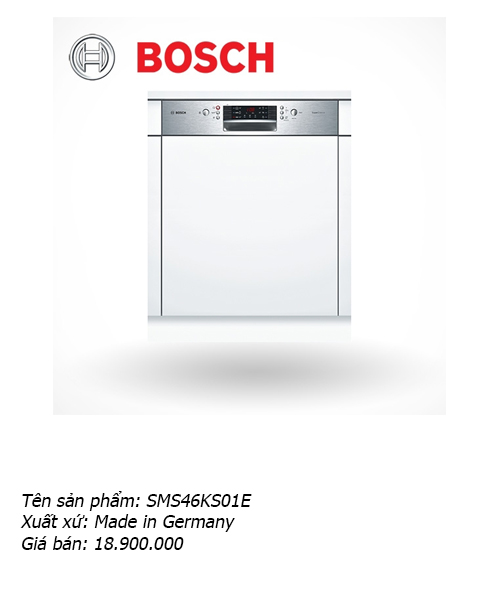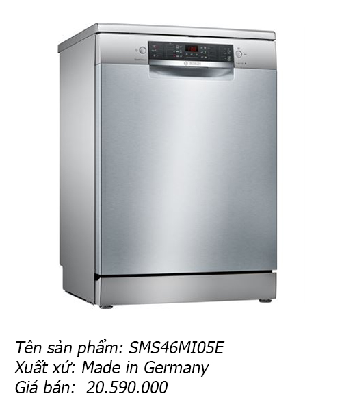 - Máy rửa bát Bosch SMS46MI05E là model mới nổi bật của Bosch hiện nay. Sản phẩm được người tiêu dùng đánh giá bởi thiết kế trẻ trung hiện đại song không kém phần sang trọng. Thết kế máy đứng độc lập chắc chắn và cứng cáp công suất rửa mạnh mẽ với 14 bộ bát đĩa.