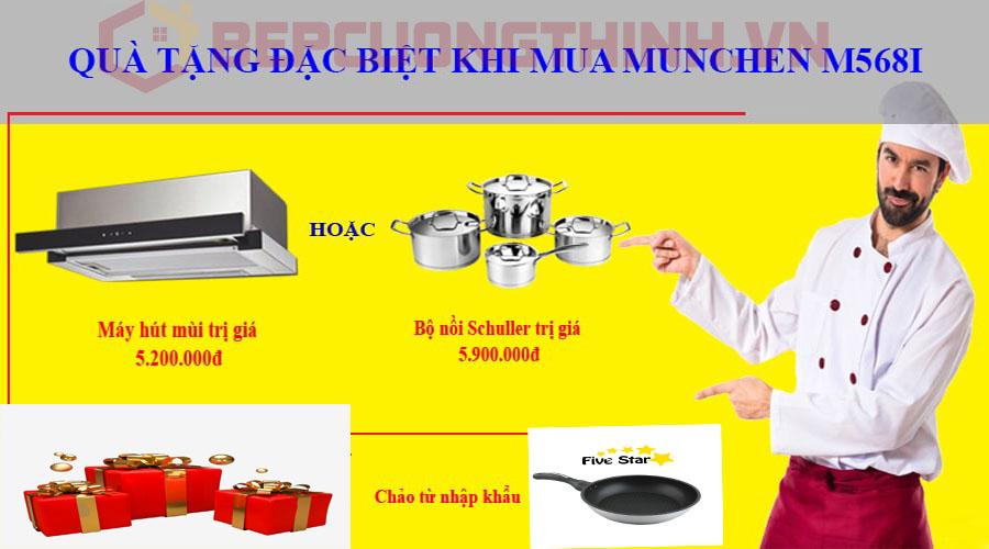 Khi khách hàng mua sản phẩm bếp từ Munchen M568i ở thời điểm này tại Bếp Cường Thịnh quý khác sẽ được tặng 1 trong 2 phần quà có giá trị sau: 01 máy hút mùi âm tủ Munchen AM 692 trị giá 5.200.000 hoặc 01 bộ nồi Munchen 4 chiếc + 01 chảo từ FiveStar trị giá gần 6 triệu đồng