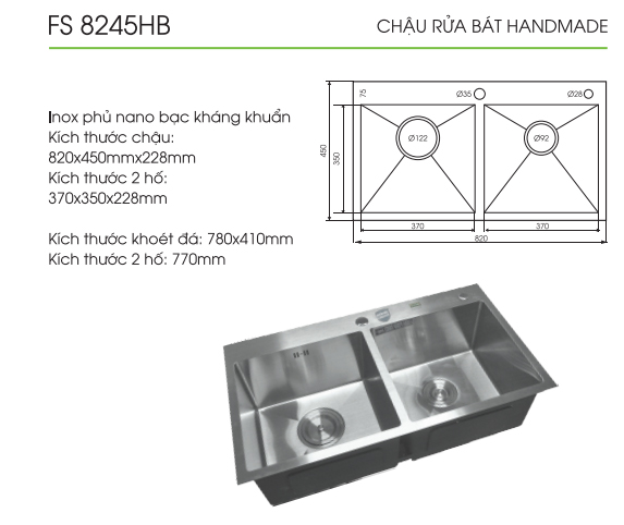 - Thiết kế chống tràn, chống ồn bằng miếng giảm ồn và phun sơn dày dặn giúp cho tiếng nước xả sẽ không bị ồn gây khó chịu cho người dùng, với thiết kế 2 hố cân không gian rửa lớn rất tiện cho việc rửa nhiều bát đĩa cùng một lúc.