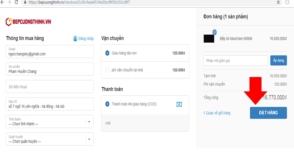 Khi bạn quyết định mua sản phẩm đó bạn tiến hành click vào Mua hàng à chọn số lượng cần mua à tiến hành đặt hàng (bạn cung cấp email, họ tên, số điện thoại, địa chỉ, chọn tỉnh thành, quận huyện, ghi chú nếu cần và chọn phương thức thanh toán). Kiểm tra lại toàn bộ lần cuối những thông tin mà bạn vừa cung cấp và click vào đặt hàng là thành công.
