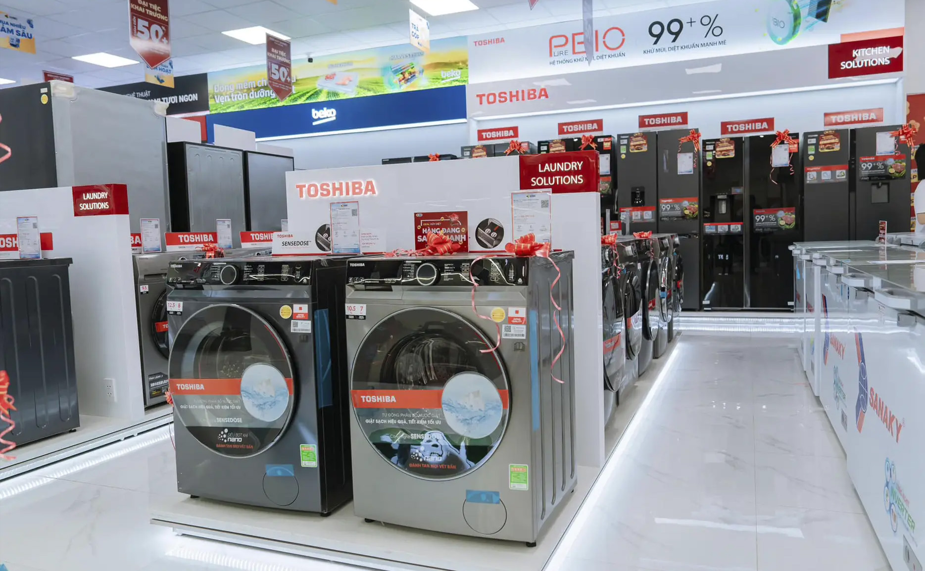 Với diện tích gần 150m2/sàn x 2 sàn. Các sản phẩm đã được bày lên kệ trang trí đẹp, ngăn nắp, khoa học và hiện đại giúp quý khách hàng dễ hơn trong việc thăm quan mua sắm cho gia đình chuẩn bị đón tết phân riêng từng khu như: Khu trưng bày tivi tủ lạnh, khu trưng bày hàng điện tử điện lạnh, khu trưng bày tủ đông tủ mát, khu trưng bày đồ điện gia dụng và khu trưng bày các sản phẩm thiết bị bếp bếp từ, bếp điện từ, máy hút mùi…