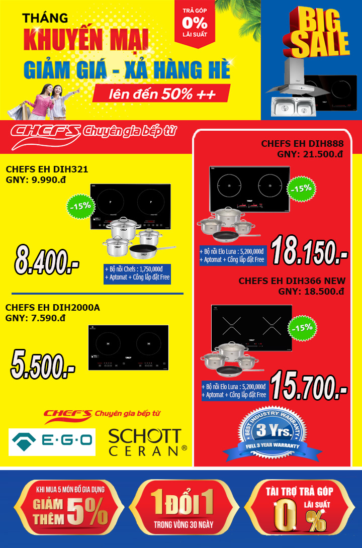 + Bếp từ Chefs EH DIH888 đang có giá bán lẻ 15,5 triệu. Kèm quà tặng bộ nồi Chefs 5 chiếc. Đặc biệt giảm thêm 5%/đơn hàng.