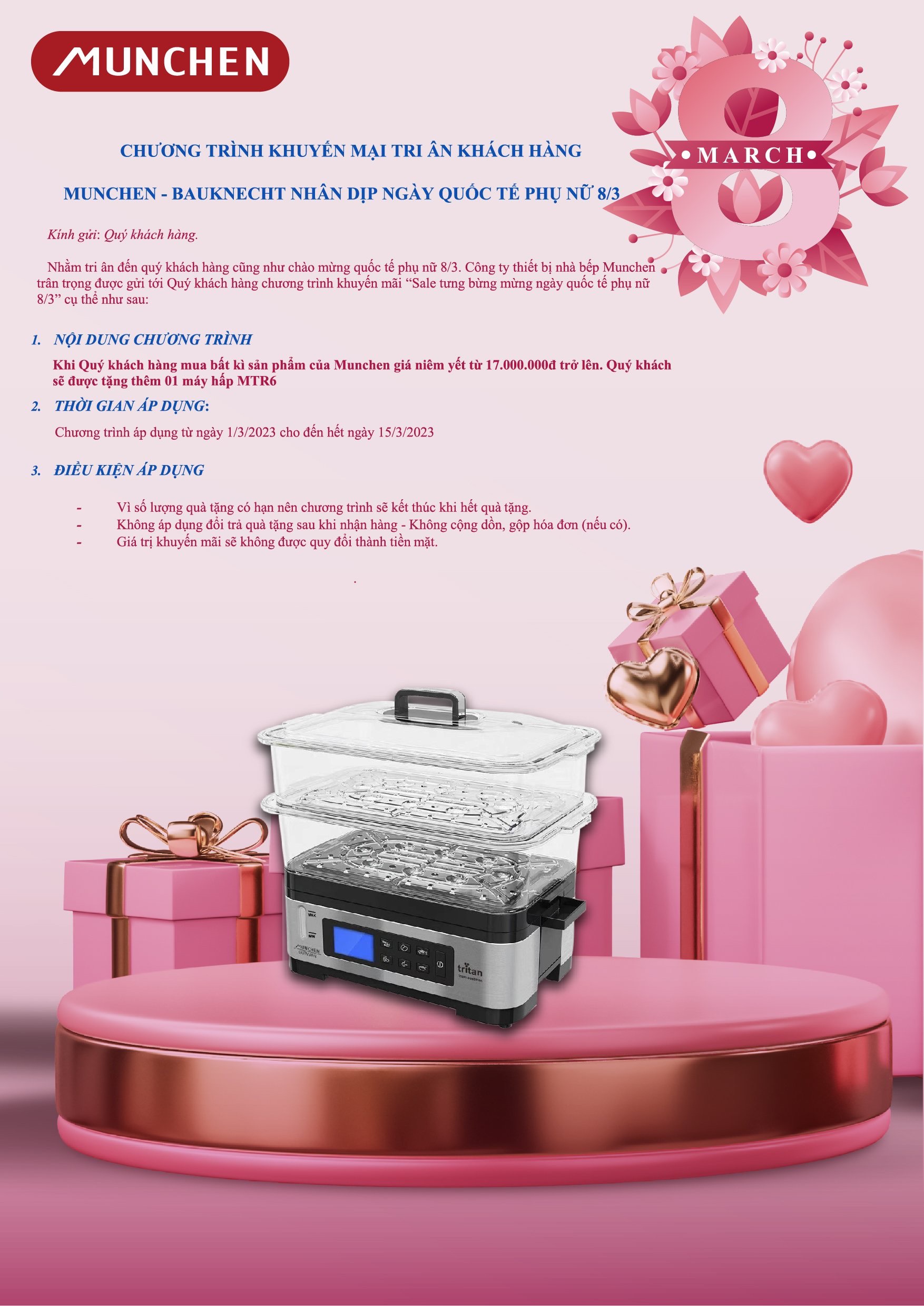 Tin khuyến mãi mới nhất nhân dịp ngày quốc tế phụ nữ 8-3. Bếp Cường Thịnh triển khai chương trình khuyến mãi hấp dẫn khi mua các sản phẩm thiết bị bếp nhãn hàng Munchen Germany. Nội dung chi tiết bên dưới, thời gian áp dụng từ 1/3 đến 15/3/2023