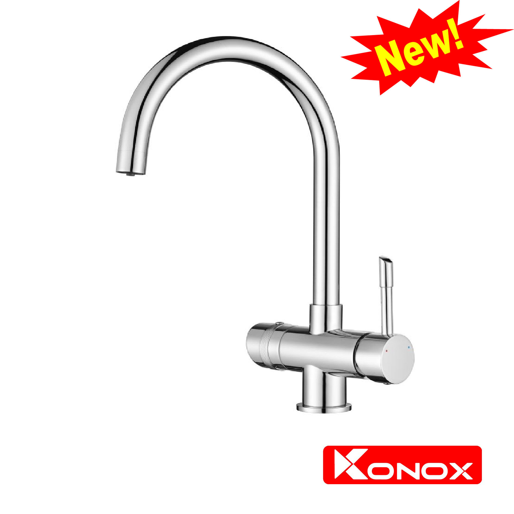 Vòi rửa Konox Trim-Water được chế tạo từ hợp kim đồng 59% tiêu chuẩn Châu Âu CW617N, với bề mặt xử lý công nghệ PVD Chrome cao cấp 5 lớp, cho độ bền màu bề mặt vượt trội và sang trọng. Vòi có thêm đường nước cho máy lọc RO tích hợp cùng 2 đường nóng lạnh.